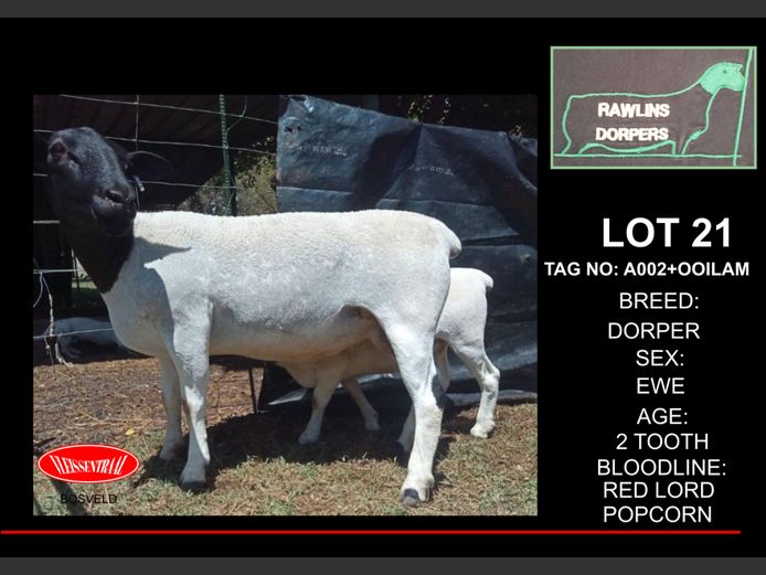 Aanbod: Dorpers: 15 Ramme & 45 Ooie | Witdorpers: 25 Ramme & 35 Ooie. Approvals end at 17:00 the day prior to the auction. Only register if you intend to bid on this auction. No registration required to watch the auction. VeeSure - versekering vir lewendehawe is op dié veiling beskikbaar. For Transport arrangements contact Graig on 082 808 7747. Invoicing | Inquiries after the Auction contact Basie on 082 261 4625.