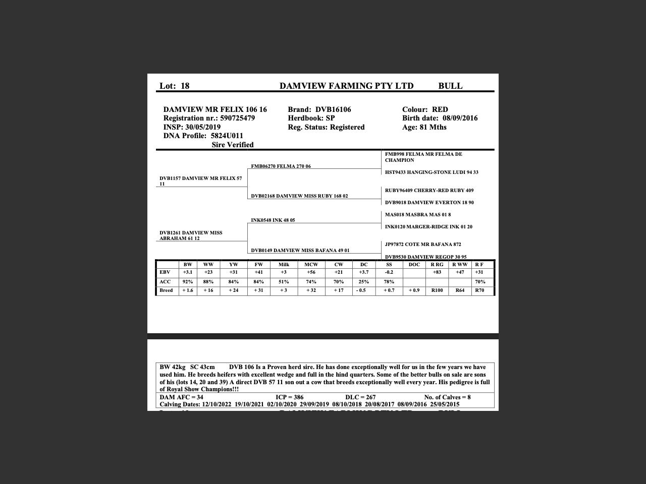 BW 42kg SC 43cm DVB 106 Is a Proven herd sire. He has done exceptionally well for us in the few years we have used him. He breeds heifers with excellent wedge and full in the hind quarters. Some of the better bulls on sale are sons of his (lots 14, 20 and 39) A direct DVB 57 11 son out a cow that breeds exceptionally well every year. His pedigree is full of Royal Show Champions!!!