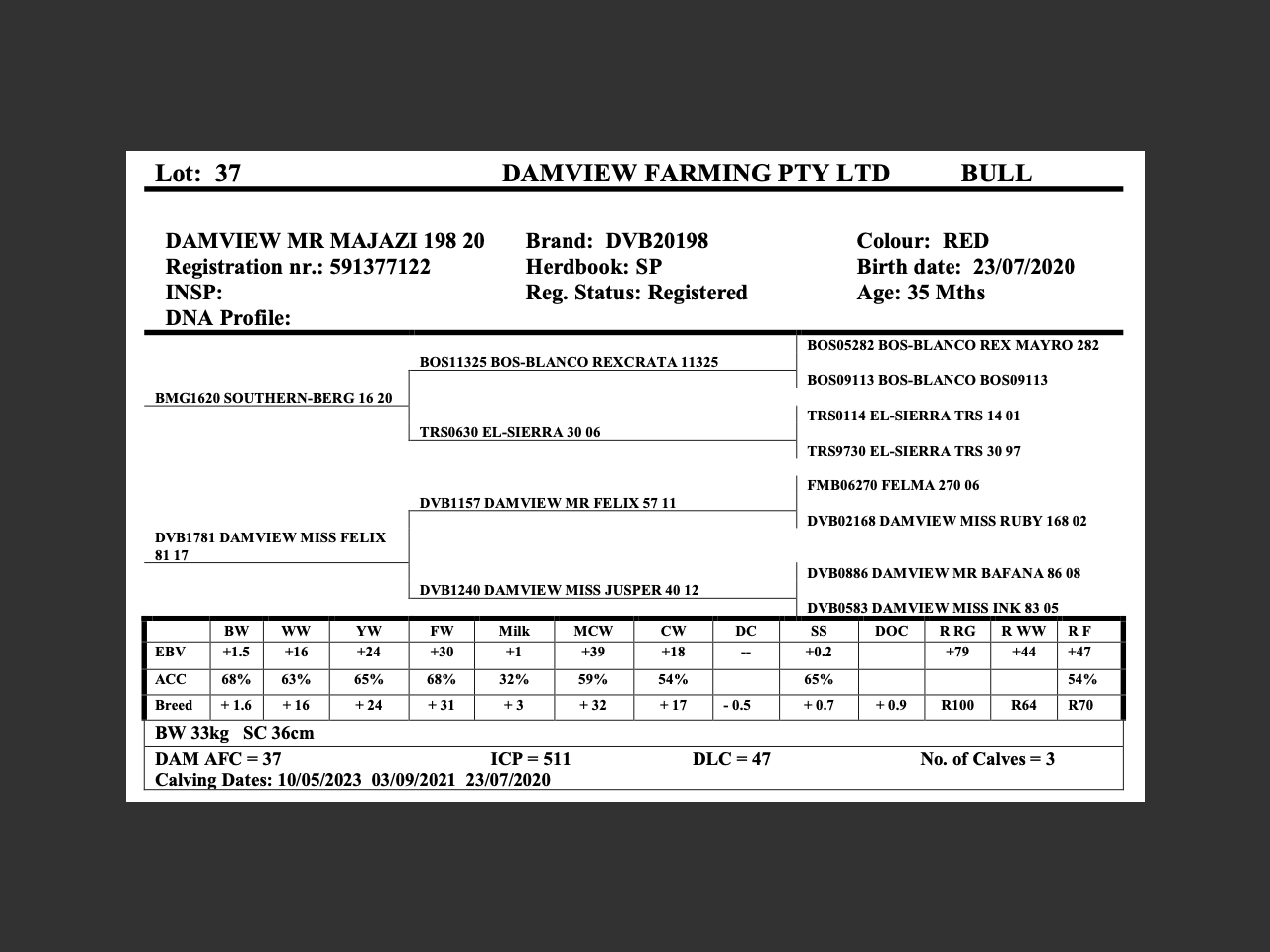 Bull | SP | Birth Date: 23/07/2020 | Red