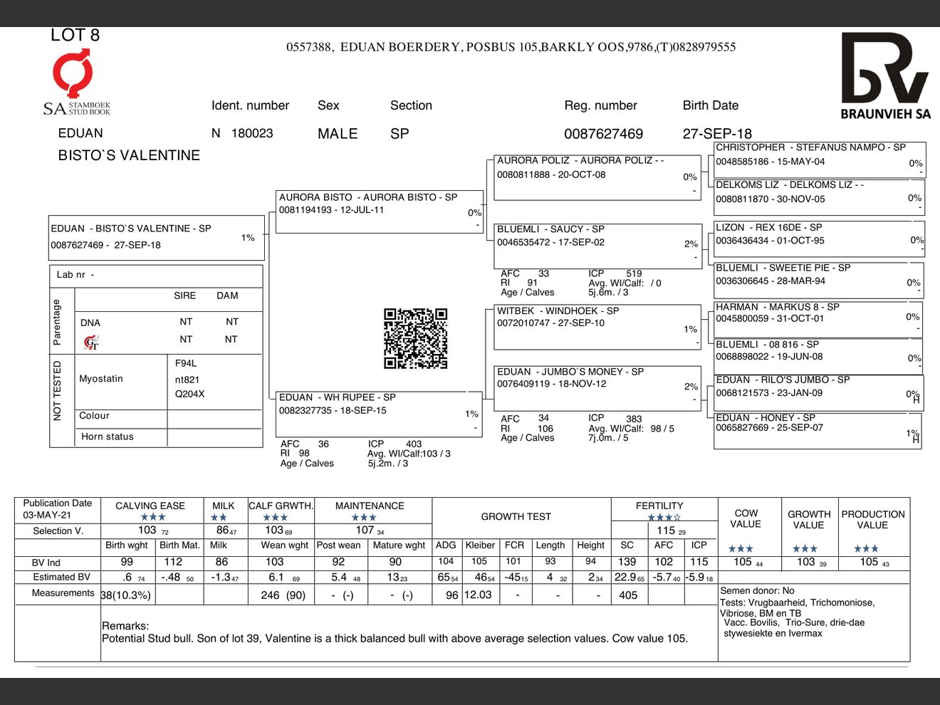 Potential Stud bull. Son of lot 39, Valentine is a thick balanced bull with above average selection values. Cow value 105