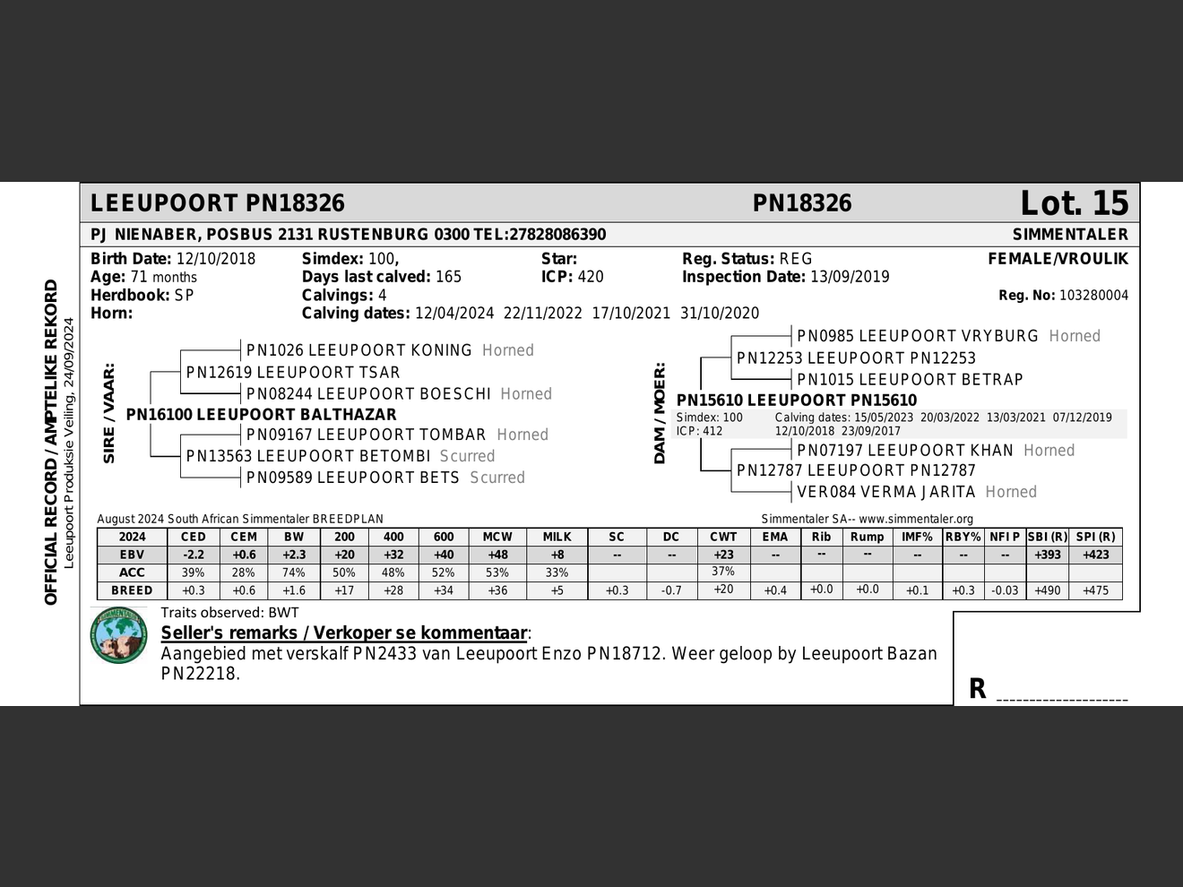 Aangebied met verskalf PN2433 van Leeupoort Enzo PN18712. Weer geloop by Leeupoort Bazan PN22218.