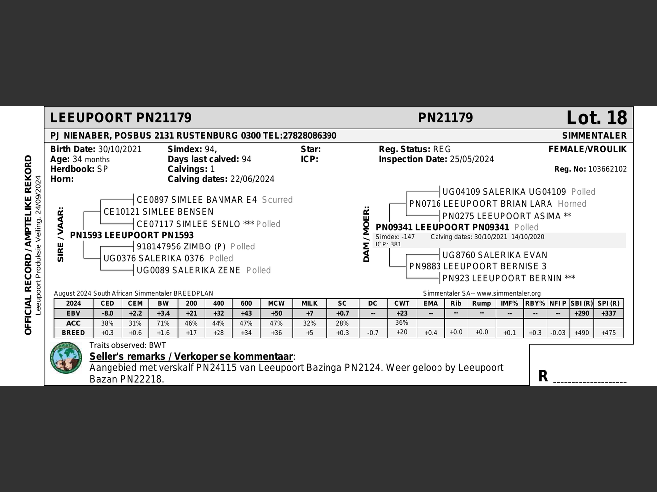 Aangebied met verskalf PN24115 van Leeupoort Bazinga PN2124. Weer geloop by Leeupoort Bazan PN22218.