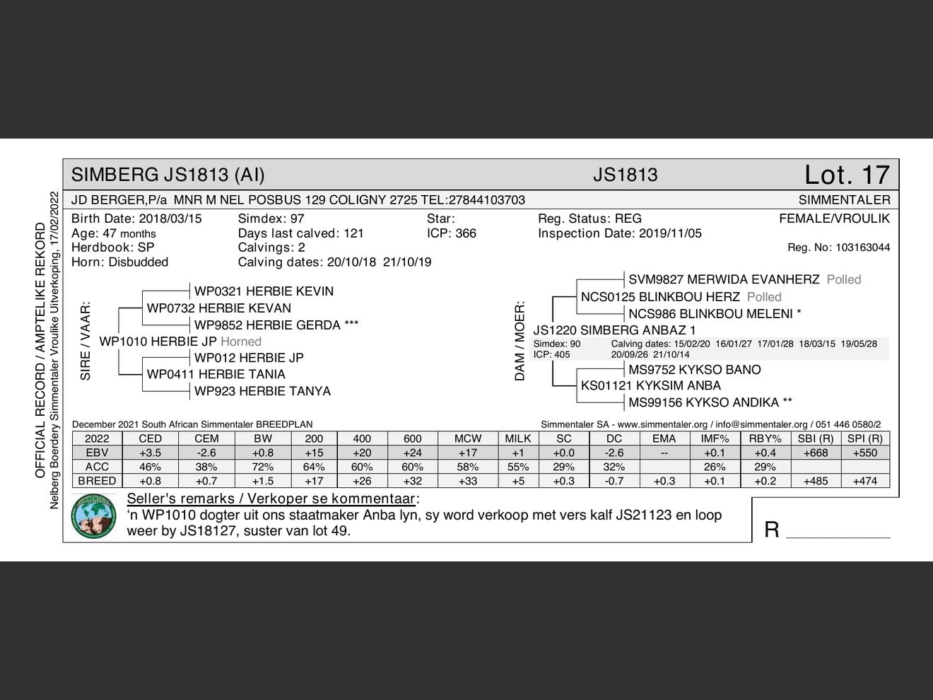 ‘n WP1010 dogter uit ons staatmaker Anba lyn, sy word verkoop met vers kalf JS21123 en loop