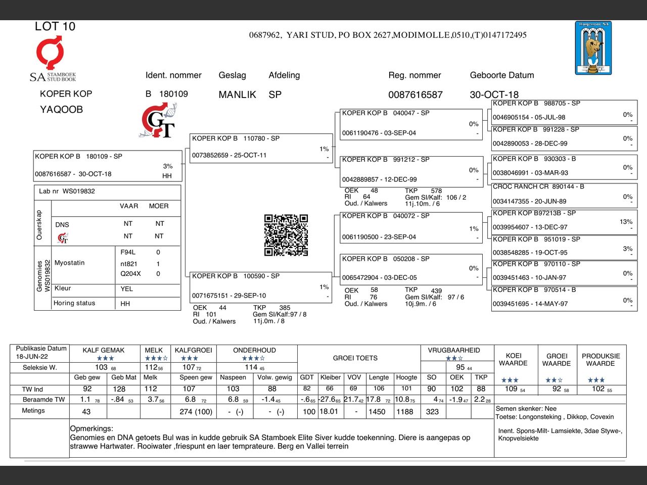 Genomies en DNA getoets Bul was in kudde gebruik SA Stamboek Elite Siver kudde toekenning. Diere is aangepas op strawwe Hartwater. Rooiwater ,friespunt en laer temprateure. Berg en Vallei terrein