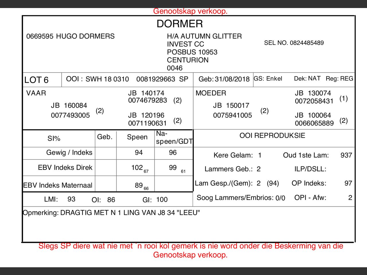 Vaar: JB 160084 | Moeder: JB 150017. DRAGTIG MET N 1 LING VAN J8 34 "LEEU"
