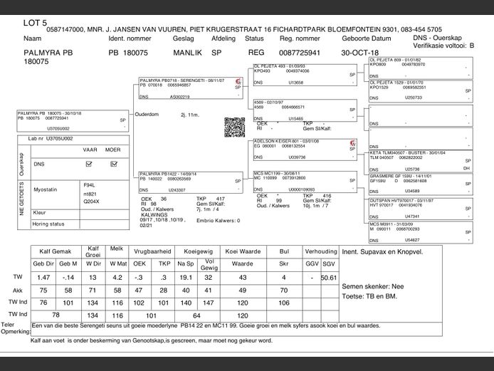 Male SP | DOB: 30-Oct-18 | Comment: Een van die beste Serengeti seuns uit goeie moederlyne PB14 22 en MC11 99. Goeie groei en melk syfers asook koei en bul waardes.