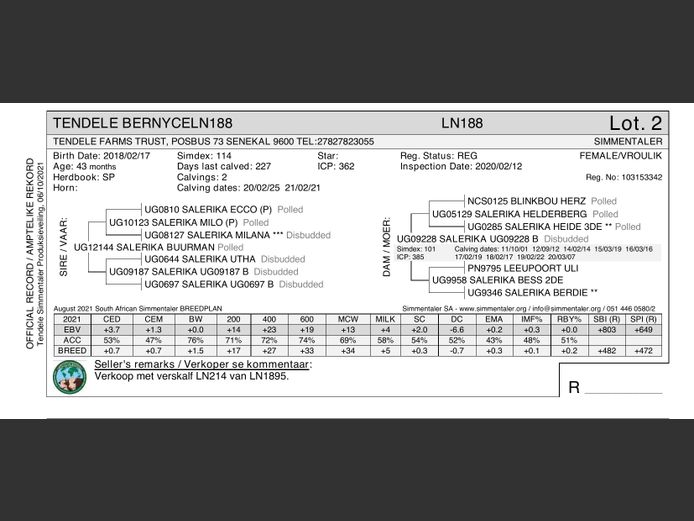 Female | SP | Birth Date: 2018/02/17 | Verkoop met verskalf LN214 van LN1895.