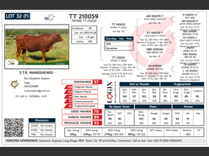 Injections: Supavax; Long Range, RB51. Tests: CA, TB and fertility. Comments: Calf at foot. Sire: A20-10 (DNA 1046U001).