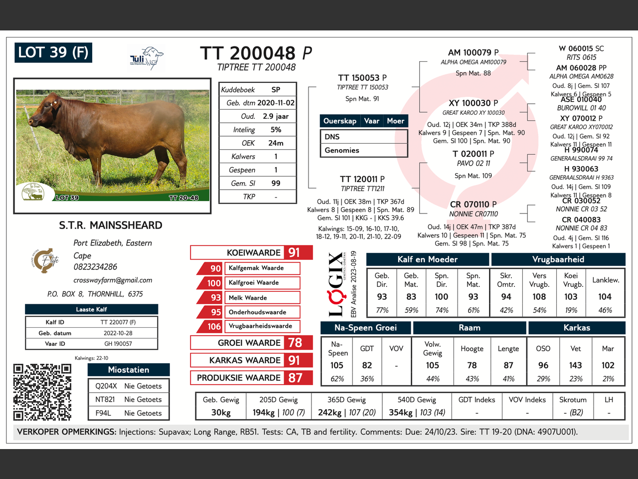 Injections: Supavax; Long Range, RB51. Tests: CA, TB and fertility. Comments: Due: 24/10/23. Sire: TT 19-20 (DNA: 4907U001).