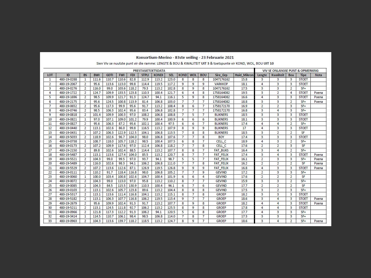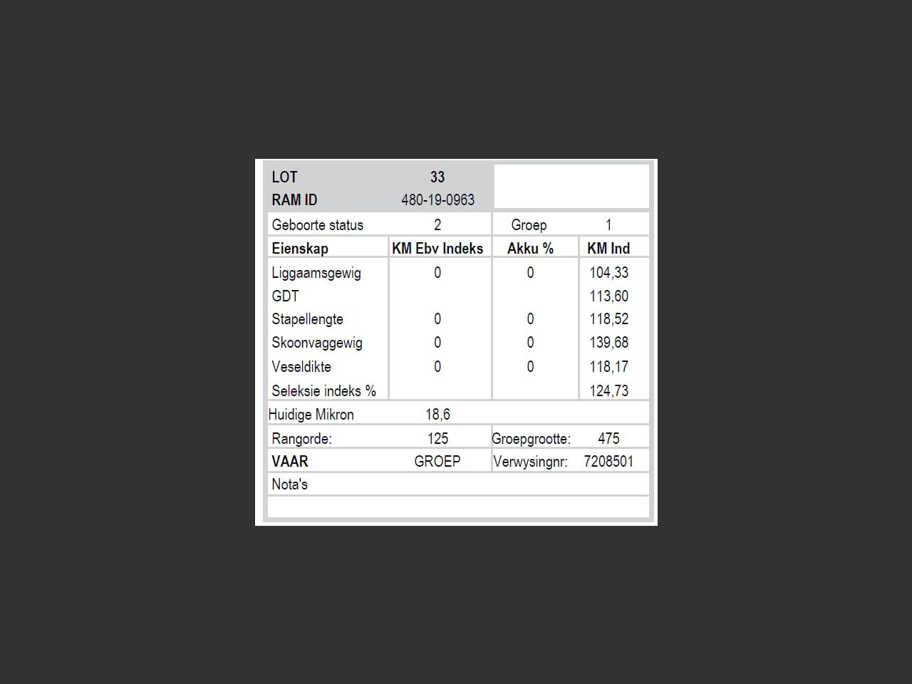 Huidige Mikron: 18.6 | Projeknr: 652 | Lengte (uit 3): 3 | Bou (uit 3): 2 | Kwaliteit ( uit 3): 4 | BSTAT: 2 | BWI: 104.328756179839 | GDTI: 113.60139651918 | FWI: 139.683489335123 | FDI: 118.171220940009 | STPLI: 118.521829060201 | KONDI: 113.15658119936 | SEL: 124.725834195253 | KOND (uit 10): 8 | WOL (uit 10): 9 | BOU (uit 10): 8 | Sire_Grp: GROEP